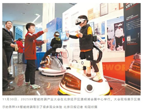 11月30日,2025XR智能终端产业大会在北京经开区通明湖会展中心举行。大会现场展示区展示的各种XR智能终端吸引了很多观众体验 北京日报记者 和冠欣摄共享工厂让创意变为现实瞬间把对方的话翻译成想要的语言,并在眼前自动生成悬浮字幕……今年,一款会翻译的AR(增强现实)眼镜在韩国大卖,发布两小时内预订就突破1万台。这款眼镜诞生在京城东南的亦庄。“即使处在嘈杂环境里,它的语音识别准确率也可达到98%。”研发这款眼镜的亮亮视野创始人兼CEO吴斐介绍,翻译眼镜既要准,还不能太重,续航也得长。这些难题的解决得益于多年攻关,还有产业链上下游的助力。他说,亦庄在芯片、显示、软件等领域都有擅长的企业,身边就是合作伙伴,能更好地助力研发生产。随着XR技术与人工智能、5G和6G等前沿科技加速融合,XR智能终端日益成为连接现实与虚拟世界的关键载体,并在工业制造、医疗健康、教育培训等高价值领域持续渗透,被视为构建未来社会的理想终端形态之一。