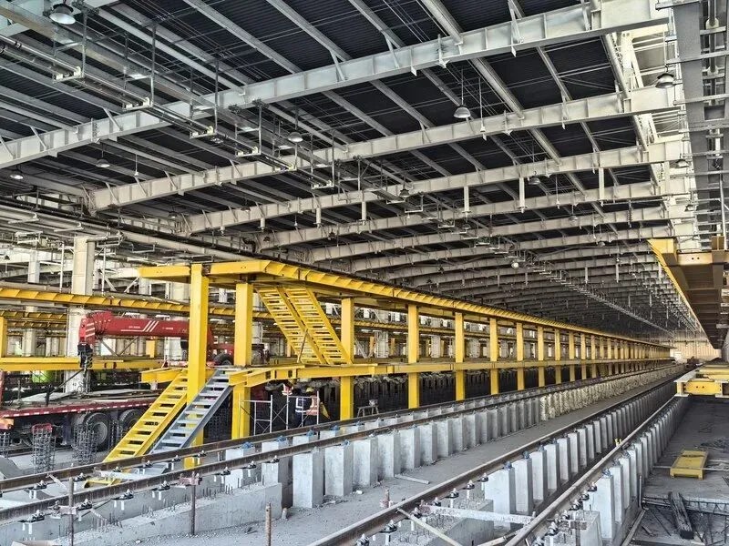 中建一局项目经理翟锡栋说:平房停车场项目承担着列车停放、日常检修以及一级维护等功能。截至目前,主体结构完成95%,二次结构完成60%。设备专业目前铺轨已经完成65%,机电安装完成约40%。